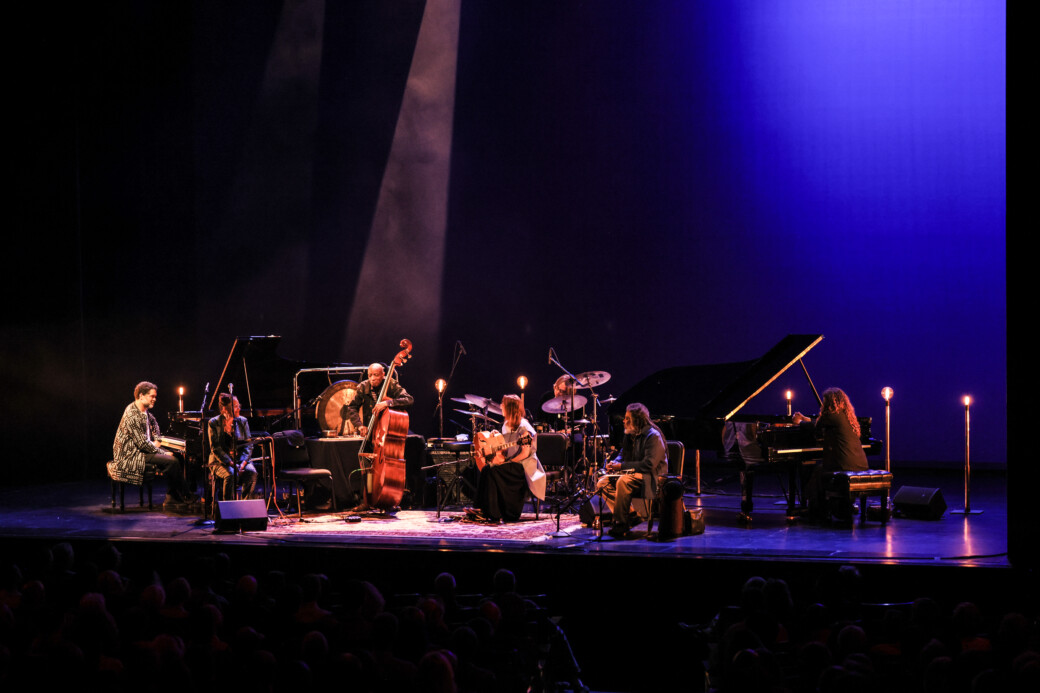 From there on, who led the music became a mystery. Through work of the six musicians onstage the spontaneous concerto grew deeper, wider, taller and fuller as they took turns to build on what ideas their fellows presented – Carrington with the kit booming like timpanis, Smith’s horn howling as a voice crying out in the desert and the two pianists conjuring twisters of notes.